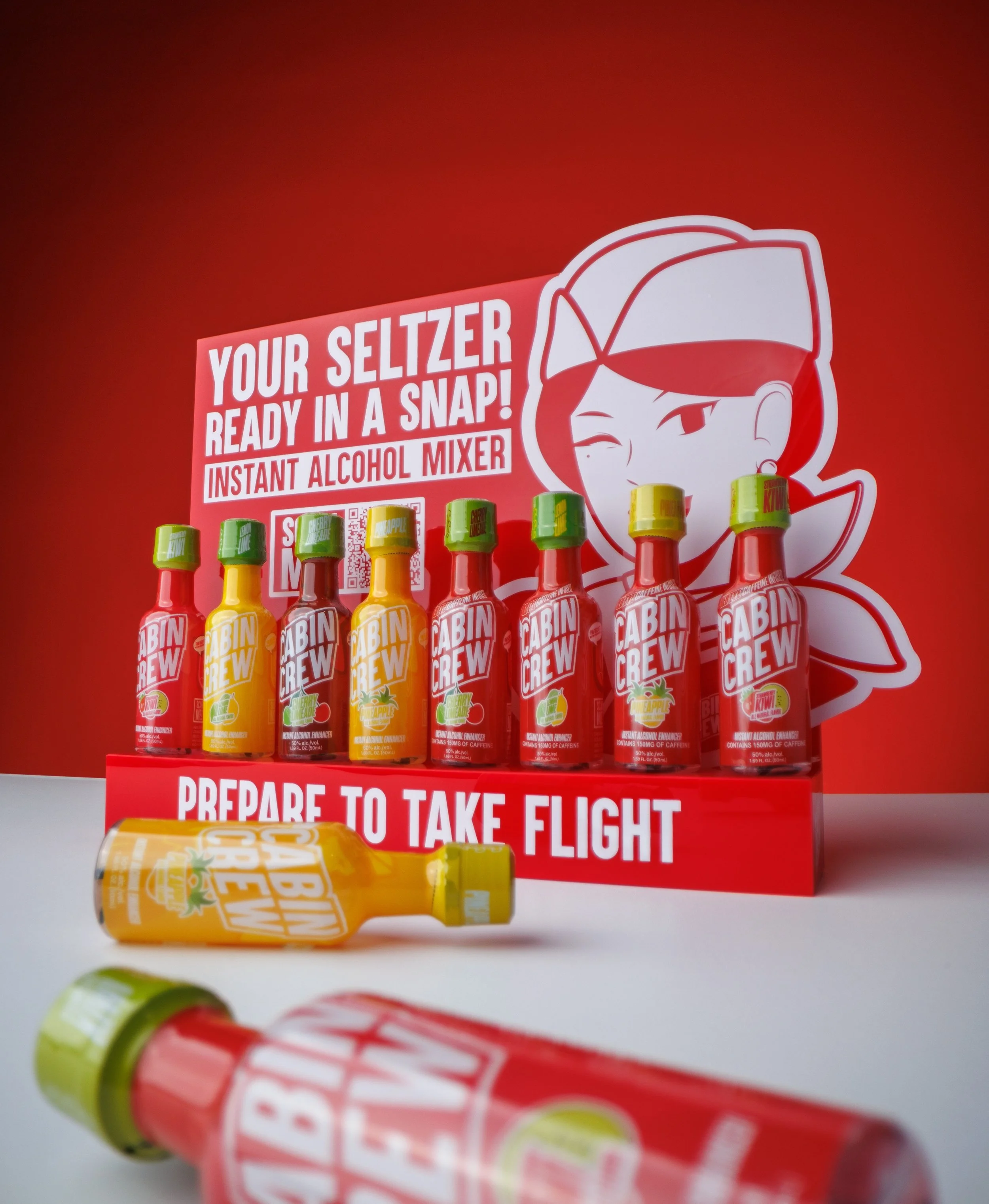 One of our designers originally suggested Cabin Crew as a nod to the cozy cabin-in-the-woods vibe. a place where good drinks and good company go hand in hand. But as soon as we heard it, our minds went somewhere else: the airline cabin. Tiny bottles. Mile-high drinks. Flight attendants with flair. That twist hit instantly. the name still captured the spirit of escape, but with a bold, cheeky aviation spin. From there, we dove into research, building an entire brand world around retro travel, freedom, and that first-class energy. Cabin Crew was officially cleared for takeoff.